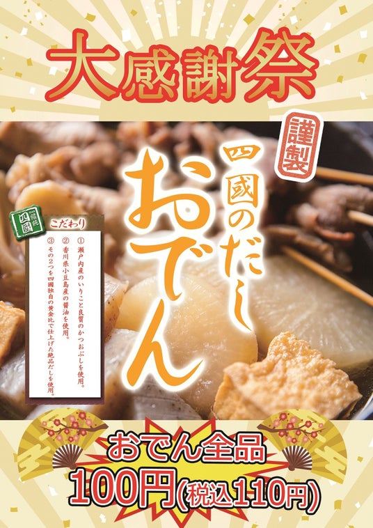 1966年、うどんの本場・香川県丸亀市で「うどん」専門店を開業し、うどんのトップブランドと称されてきました「讃岐うどん」の美味しさを世に広めてきた「饂飩の四國」。現在は居酒屋風の業態も取り入れ、「うどん居酒屋」としても親しまれています。そしてこの度、日頃のお客様への感謝の気持ちをこめて月に一度の大感謝祭を第3火曜日に開催しています。11月は19日(火)。おでん全品を110円(税込)で提供をさせていただきます。「四國独自の黄金比」で仕上げた絶品のだしに大根、厚揚げ、こんにゃくなど冬の季節にぴったりのメニューをお得な価格でお楽しみください。皆さまのご利用をスタッフ一同お待ちしております。
