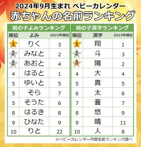2024年9月生まれ男の子に人気の名前のよみ・漢字ランキング|ベビーカレンダー月間名前ランキング調べ