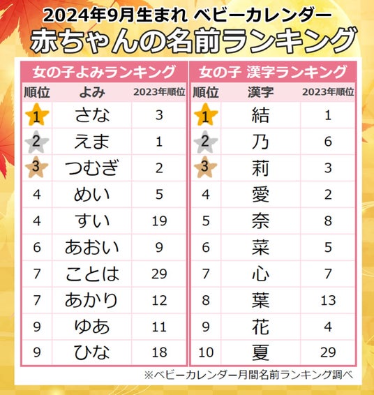 2024年9月生まれ女の子に人気の名前のよみ・漢字ランキング|ベビーカレンダー月間名前ランキング調べ