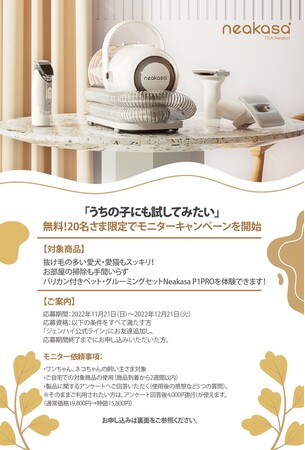 ジェンハイジャパン(神奈川県横浜市鶴見区 代表取締役:王忠林)は、より便利なライフスタイルの実現に向け、ロボット掃除機やペットグルーミングキットを設計・販売してきましたが、この度テレビ放送商品の最新ペット用グルーミング機器Neakasa を動物病院に無料モニターキャンペーン実施開始!