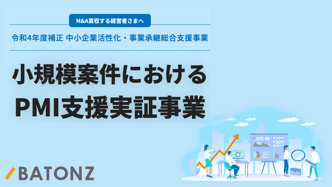 M&A総合支援プラットフォーム「BATONZ(バトンズ)」を運営する株式会社バトンズ(本社:東京都中央区、代表取締役CEO:神瀬 悠一、以下バトンズ)は、「令和4年度補正中小企業活性化・事業承継総合支援事業(小規模案件におけるPMI支援実証事業)」の実施機関として採択を受け、M&Aの譲受側を対象として中小企業M&A におけるプレPMI・PMI 支援の型化と普及に向けた実証事業を開始しますので、お知らせします。