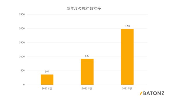 中小企業は、地域経済や雇用を担う重要な存在です。帝国データバンクの調査によると、2022年度における社長の平均年齢は60.4歳で過去最高を更新し、50歳以上が8割を占めるという結果になり、5年間で3.0pt上昇しました。中小M&Aは、雇用の維持や貴重な文化技術の伝承を目的として注目度が高まっている領域です。バトンズを利用した中小M&Aの年間成約件数も、2020年度は累計364件でしたが、2021年度は923件、2022年度には前年比約2倍の1,990件まで増加しました。