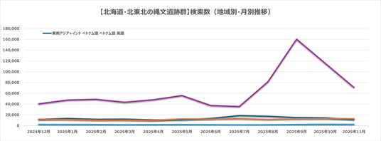 地域別では欧米豪からの検索が圧倒的多数を占めています。特に2025年9月に検索数が大幅に増加しましたが、これは同月に開催された国際的な観光見本市で、自然と共生する「アドベンチャーツーリズム」の重要拠点として本遺跡群が紹介されたこと*1や、大阪・関西万博開催が影響し、欧米の主要旅行メディアが「日本のサステナブルな歴史遺産」として特集を組んだことが、英語圏での関心の高まりに寄与した可能性があります。