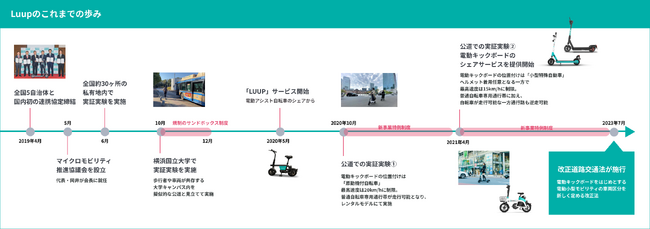 Luupは、政府に適切なルール整備を行ってもらうため、2019年より全国30箇所以上の私有地・公有地にて電動キックボードの実証実験を実施し、街の皆さまの声を聞いてまいりました。2019年の大学キャンパス内での実証実験、2020年の原動機付自転車としての公道での実証実験を経て、2021年4月から関係省庁によるルール整備に向けた実証実験に参加し、電動キックボードのシェアリングサービスの提供を開始しました。