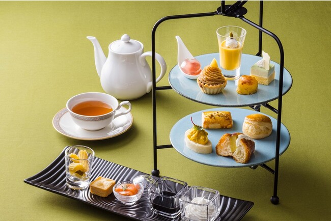 秋冬の味覚、栗、さつまいも、かぼちゃを中心としたスイーツが並ぶアフタヌーンティー。濃厚な味わいの栗のモンブランや、なめらかな口当たりのパンプキンプリンなど素材の甘さが引き立つメニューに加え、ほどよく塩味の効いたピクルスなどのセイボリーも。