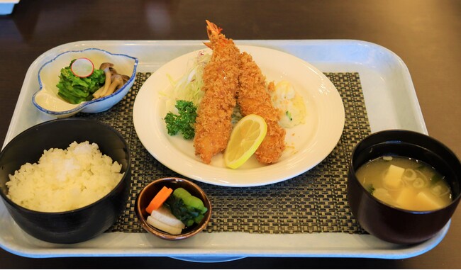 えびフライ定食 850円(ごはん、みそ汁、小鉢、漬物付き)