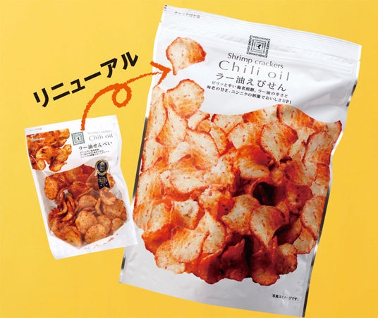 株式会社 紀ノ國屋は、発売以来、菓子部門売上個数第1位の「ラー油せんべい」を、よりわかりやすい商品名の「ラー油えびせん」としてリニューアルいたします。