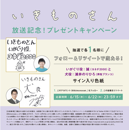 いがぐり役:誠(ヨネダ2000)と犬役:浦井のりひろ(男性ブランコ)のサイン入り色紙をプレゼント。(各1名、プレゼント内容の指定はできません)。 いきものさん公式Twitterにて実施いたします。