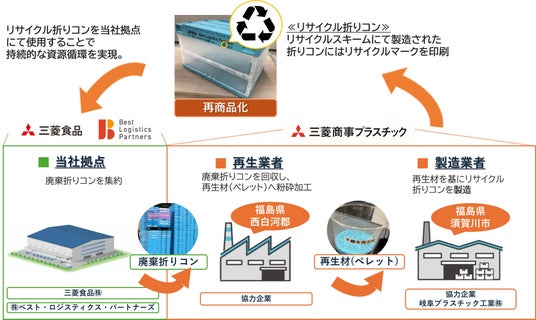 三菱食品株式会社(所在地:東京都文京区、代表取締役社長:京谷裕)は子会社の株式会社ベスト・ロジスティクス・パートナーズ(所在地:東京都文京区、代表取締役社長執行役員:小谷光司)と三菱商事プラスチック株式会社(所在地:東京都千代田区、代表取締役社長:早澤幸雄)の協力のもと、不要となった物流資材(折りコン※)を1.回収、2.粉砕、3.素材化、4.リサイクル材50%とバージン(新品)原料50%を配合した原料による折りコンの再商品化、4つの工程でリサイクルする取り組みを2025年7月に開始いたしました(下図参照)。※折りコンとは、折りたたみコンテナの略