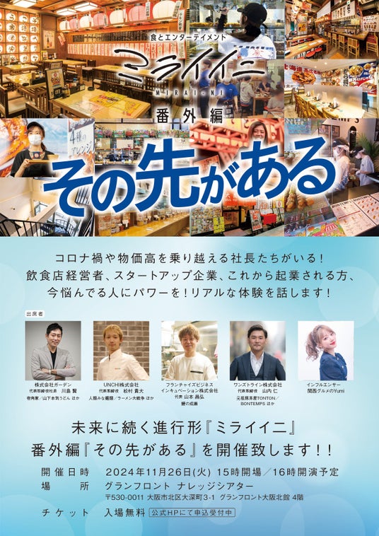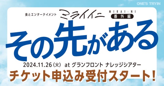 香ばしい味わいが人気の帯広豚丼「元祖豚丼屋TONTON」や、カフェ&韓国ドーナツ「BONTEMPS」など飲食FCを展開するワンズトライン株式会社(本社:大阪市北区芝田2丁目3番16号、代表取締役:山内仁)が、食とエンタメの祭典『ミライイニ』の番外編として、24年11月26日(火)大阪・グランフロント ナレッジシアター(大阪市北区大深町3-1 グランフロント大阪北館 4階)にて開催する『その先がある』の入場チケット申し込みの受付を開始いたしました。