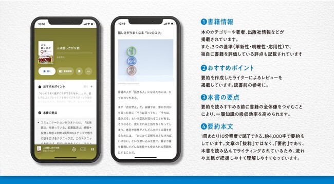 「flier」に掲載される要約は出版会社・著者から許諾を得た質の高いもので、ユーザーは通勤や休憩時間などのスキマ時間を活用して、教養やビジネススキルを習得することができます。