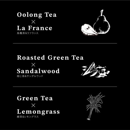 お茶の香りをベースにした「烏龍茶×ラフランス」「焙じ茶×サンダルウッド」「緑茶×レモングラス」