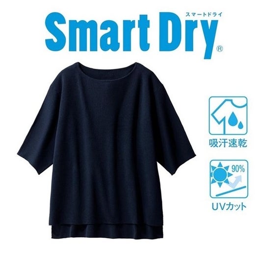 スマートドライ ウェアは寝具綿タッチのポリエステルを使用し、優しい肌ざわりに仕上げています。速乾性に優れ、程よい伸縮性で選択してもシワになりにくく、お手入れがラク!優れた吸水性で汗を素早く吸収し、サッと乾いて爽やかさをキープします。UVカット90%以上で、肌にダメージを与える紫外線を軽減できるのも嬉しいポイント!