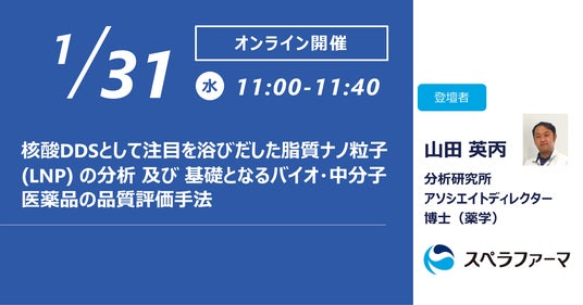 スペラファーマ株式会社(本社:大阪府大阪市、代表取締役社長:岩城 慶太郎)は、2024年1月31日(水)に「核酸DDSとして注目を浴びだした脂質ナノ粒子(LNP)の分析及び基礎となるバイオ・中分子医薬品の品質評価手法」ウェビナーを開催いたします。