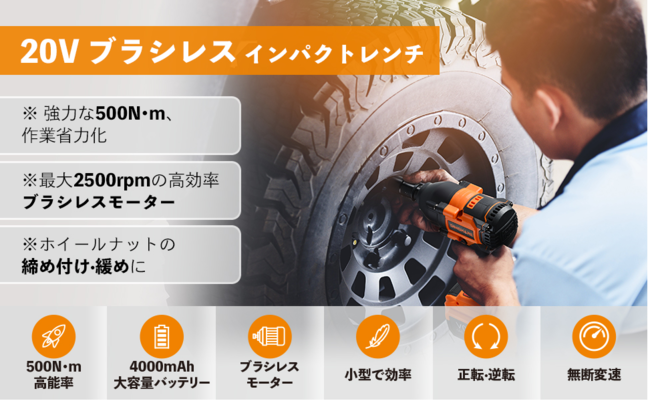 弊社のインパクトレンチは最大トルク500N.m、最大回転数2500RPMまで達せます。正面にあるスイッチの引き加減で回転スピードが自在に変えられるので、初心者の方でもナットなどの締めの強弱がつけられて繊細な作業にも大活躍できます。