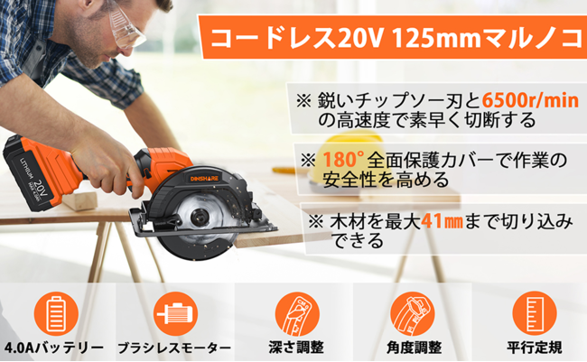 DINSHAREの電動マルノコは強力なブラシレスモータを搭載し、安定した動作と高効率な木材切断作業を実現できます。回転数は6500r/minで切断するだけでなく、深さを変えることで溝を作ることもできます。