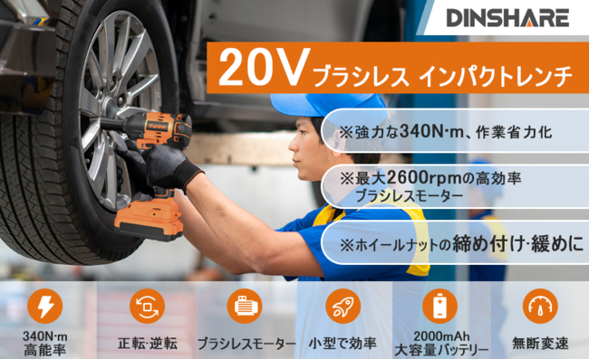 DINSHAREインパクトレンチは、最大トルク340N.m、最大回転数2600RPMまで達せます。高トルクと高回転数を両立することで、ボルトやナットを締められるため、手動のレンチよりも作業を効率化できます。