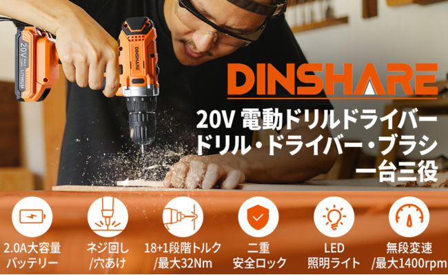 パワフルで精密な制御ができるDINSHARE 12V電動ドリルドライバーです。トルクは最大32N·mでDIYなどの作業では十分なパワーがあり、ネジ締めや穴あけが素早くできるのは魅力的なポイントです。