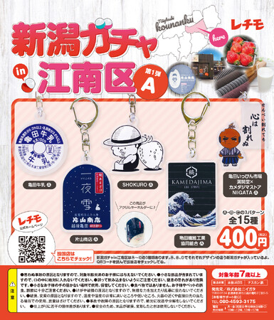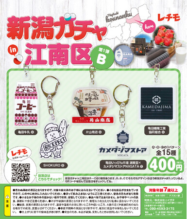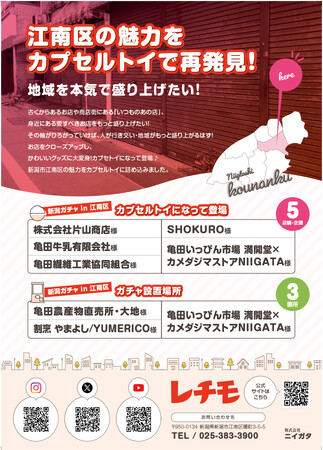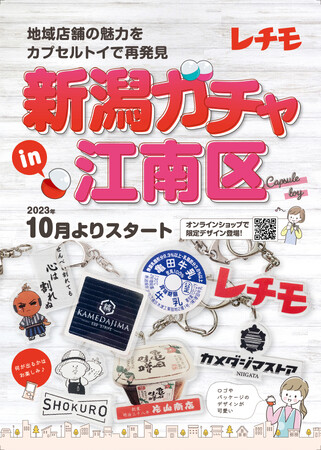 新企画「レチモ」は、新潟の実在する店舗・団体にクローズアップし、商品・看板のデザインをかわいいグッズとしてカプセルトイ「新潟ガチャin江南区」として販売し、地域の魅力を広く発信する取り組みです。