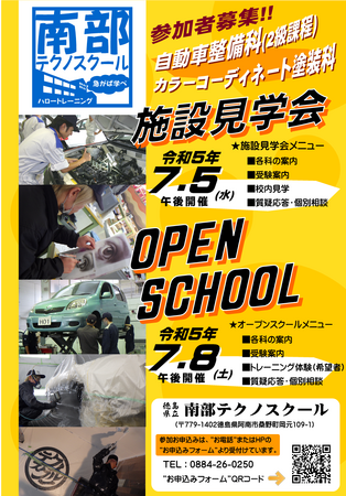 公共職業訓練校「徳島県立南部テクノスクール」は、以下の日程で令和5年度の施設見学会及びオープンスクールを開催します。