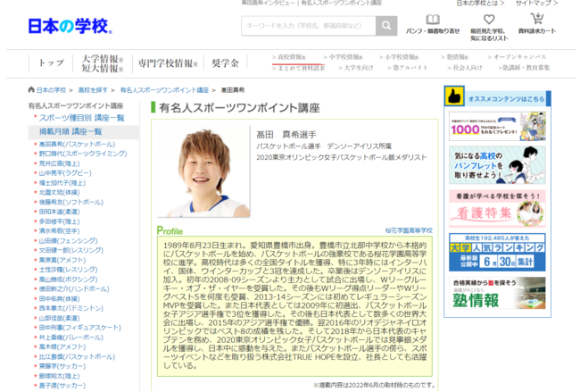 全国の大学・短大・専門学校などの学校情報を提供する、株式会社JSコーポレーション(本社:大阪市北区 代表取締役社長:米田英一)は、スポーツワンポイント講座「バスケットボール/高田真希選手」(https://school.js88.com/scl_h/onepoint-advice/sport?item=4&athlete=199)」を公開しました。