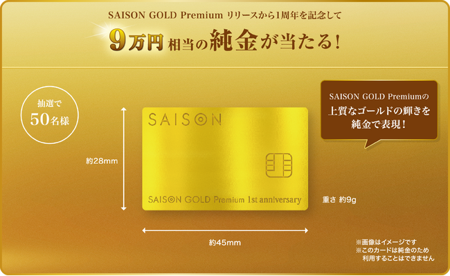 9月1日(金)~10月31日(火)の期間中、エントリーのうえSAISON GOLD Premiumでショッピング金額合計50,000円(税込)以上ご利用いただくと、抽選で50名様に純金(9万円相当)、5,000名様に5,000円キャッシュバックをプレゼントいたします。さらにショッピング金額合計50,000円(税込)以上ご利用で、もれなく200円キャッシュバックいたします。キャンペーンについて詳しくは下記URLよりご確認ください。