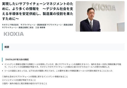 キオクシアは今後も「FASTALERT」の活用を通じて、製造業としての社会的責任である製品の安定供給を支える、サプライチェーンの強靱化を進めていきます。