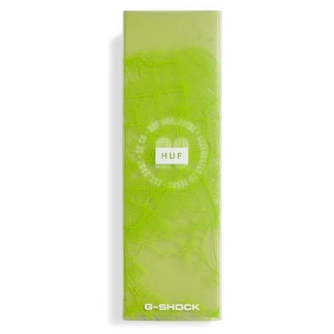 HUF X G-SHOCK「GA2100HUF-5A」は、HUFの20周年記念プロジェクトの一環として製作され、HUFのブランドカラーであるネオングリーンのアクセントとブランドロゴを文字盤に配し、HUF20周年ロゴを裏面に刻印し、両ブランドのエレメントをデザインに反映しています。