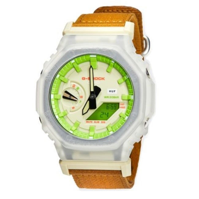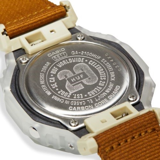 また、この「GA2100HUF-5A」は、G-SHOCKのクラシックなコニャックブラウンのナイロンリストバンドを起用し、両ブランドのファンにとって嬉しい特別仕様となっています。