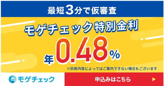 住宅ローン比較診断サービス「モゲチェック」を運営する株式会社MFS(本社:東京都千代田区、代表取締役CEO:中山田 明、以下「MFS」)は、金融機関と連携してモゲチェック住宅ローン診断のユーザーに対してのみ適用される、年0.480%(変動金利)の特別商品を案内します。また、本商品は、銀行への事前審査申込み後、最短3分で審査結果を確認できます。