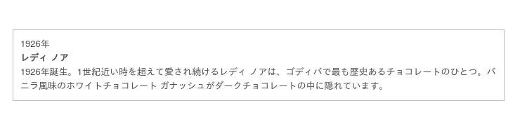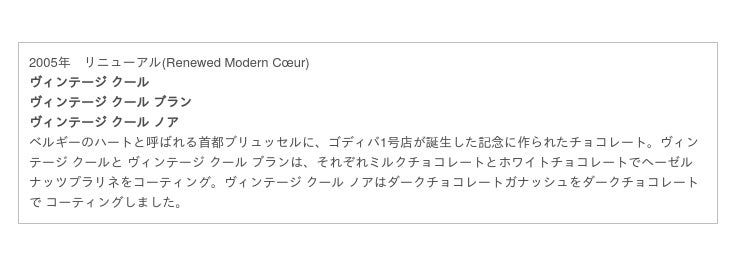 1926年に誕生し時を超えて愛され続ける、ゴディバで最も歴史ある 『レディ ノア』や、ベルギー王室御用達ブランドとして認定されたことを記念して1968年に誕生した『エキュソン』、1972年に日本初出店を祝ってつくられた、メモリアルなひと粒『ニッポン』、そしてゴディバがお客様に幸せと愛をお届けする架け橋になれるようにと、願いを込めて創り上げたチョコ レート『心の架け橋』など、歴代の記念に残るチョコレートをアソートしました。さらに、ブリュッセルにゴディバ1号店が誕生したことを記念して作られたチョコレート『クール』は、日本上陸50周年を祝し、ミルク・ダーク・ホワイトの3種を当時のままに復刻します。