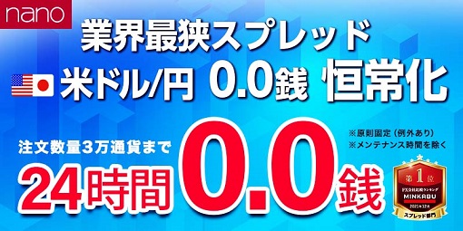 株式会社 マネーパートナーズ(代表取締役社長:福島秀治、本社:東京都港区、以下「当社」)は、パートナーズFXnanoキャンペーンで提示している、業界最狭スプレッド「米ドル/円」24時間『0.0銭』 原則固定(例外あり) を1月18日より恒常化いたしました。