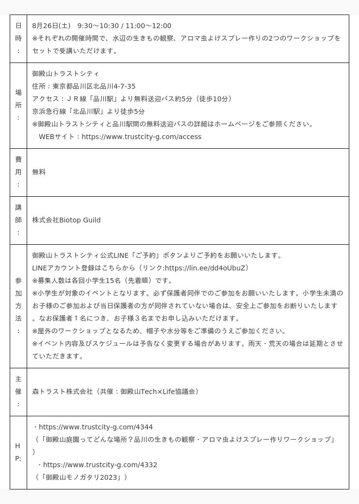森トラスト株式会社(本社:東京都港区 代表取締役社長:伊達 美和子)は、品川御殿山エリアの地域コミュニティ形成を目指したプロジェクト「御殿山モノガタリ2023」(以下、当プロジェクト)を始動しますので、お知らせいたします。当プロジェクトでは御殿山トラストシティを拠点としたイベントを定期開催し、その第1弾として、2023年8月26日(土)に親子向けイベント「御殿山庭園ってどんな場所?品川の生きもの観察・アロマ虫よけスプレー作りワークショップ」を開催いたします。