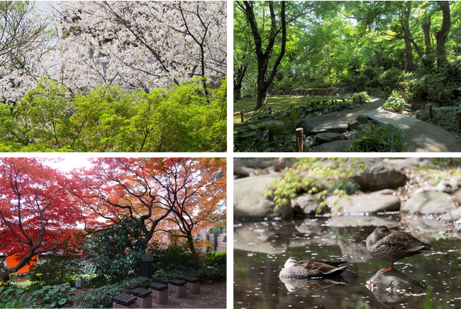 庭園内では豊かな水をたたえる池や滝に加え、春にはウメやサクラ、初夏にはアジサイやナシの花、秋にはモミジやイチョウの紅葉、冬にはカンツバキなどが見られ、四季折々の自然が楽しめるスポットです。