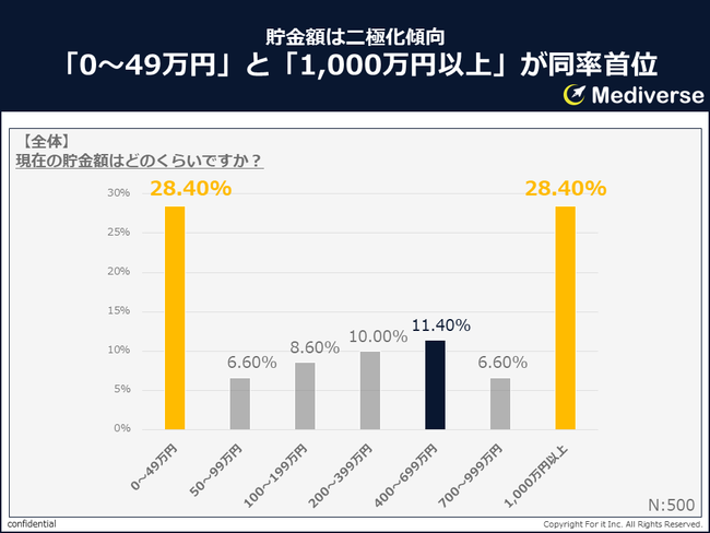 今回のアンケート調査結果では、貯金額は二極化傾向にあり、年代別・世帯年収別に見ても、貯蓄格差が生じていることが判明いたしました。