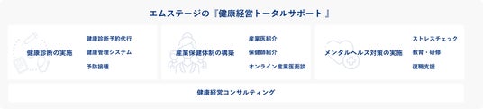 エムステージの産業保健事業部は、今後も、産業保健体制・健康診断・メンタルヘルス対策の3つを軸にした総合的な支援サービス『健康経営トータルサポート』を通して、企業の意義ある産業保健活動・健康経営の実現と促進をめざしてまいります。