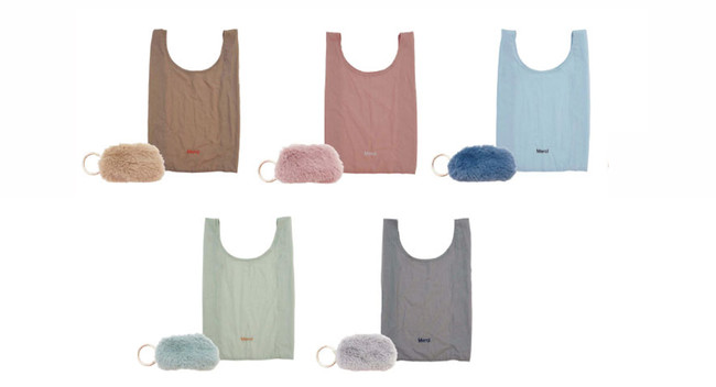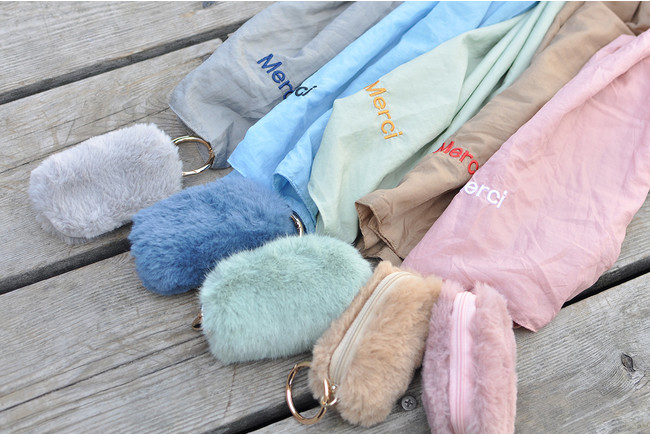 手のひらサイズのファーのポーチは、バッグにつけられるリング付き。ポーチの中にはレジ袋型のエコバッグが収納されています。普段のファッションにも合わせやすい淡い色合い。
