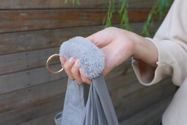 バッグを広げたらポーチは持ち手に付けて、ファーの触り心地がきもちいいグリップとしても使えます。