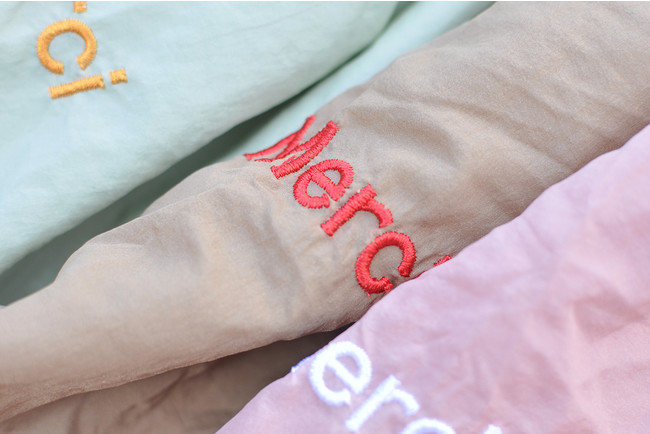 バッグにはMerciの刺しゅう入り。本体生地との色の組み合わせもポイント。