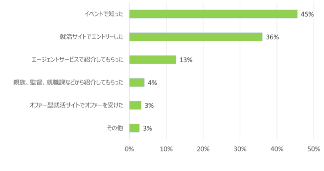 内々定のきっかけとしては【イベントで知った】と回答した学生が最も多く、全体の45%となった。