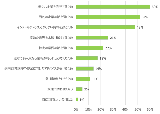 就活イベントの参加目的についての質問では【様々な企業を発見するため】という回答が全体の60%であった。次いで【目的の企業の話を聞くため】という回答が52%となった。