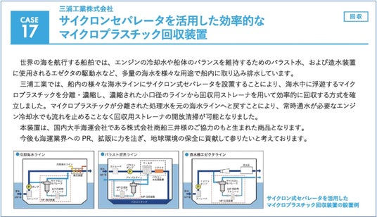 グッド・プラクティス集はマイクロプラスチックの発生抑制、流出抑制、代替、回収等に関する日本企業等の最新の取り組みや技術・ノウハウを取りまとめた資料です。このたび2024年度版にミウラが株式会社商船三井様と共同で開発プロジェクトを行い、2023年7月に販売を開始したマイクロプラスチック回収装置が掲載されました。