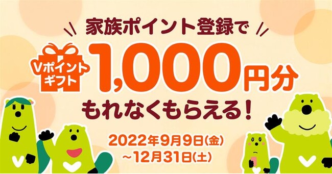 期間中に新規で家族ポイントに登録いただいた方へ、もれなく1,000円分のVポイントギフトをプレゼントするキャンペーンを実施いたします。