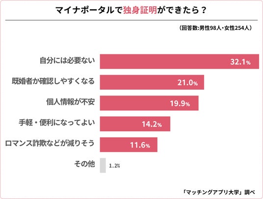 約3人に1人は「自分には必要ない」と回答しました。恋人探しや婚活以外では利用するシーンが少ないのかもしれません。続く2位は21.0%の「既婚者かどうか確認しやすくなって良い」、3位は「マイナンバーカード内の個人情報のセキュリティが不安」となりました。