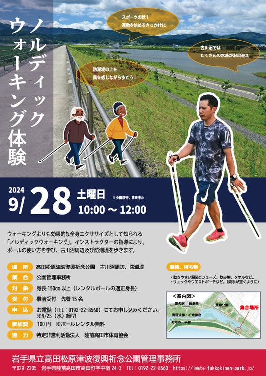 岩手県立高田松原津波復興祈念公園では、「ノルディックウォーキング体験」を初開催いたします。自然の中で運動を楽しむことにより、体力向上やストレス解消、心身のリフレッシュを図ることを目的とします。また、ノルディックウォーキングを日常的に取り入れるきっかけをつくることで、公園のフィールドを活用した健康で活力ある生活をサポートします。