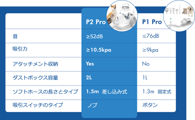 P2proは、初代P1proをお使いいただいたユーザーの声を元に改良しました。そのため、細かな部分を設計し直し、飼い主さまにとって扱いやすく、イヌネコに対して音に配慮しました。
