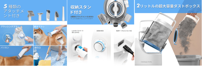 P2proは、イヌネコの毛を吸い取りながらグルーミングできるという製品です。5種類のアタッチメントから「ブラッシング」「毛を梳く」「足裏などのバリカンカット」「清掃」の4つの用途に使い分けることができます(下左図)。