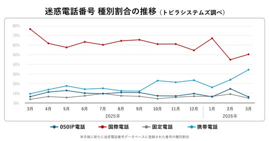特殊詐欺やフィッシング詐欺の対策サービスを提供するトビラシステムズ株式会社(本社:愛知県名古屋市、代表取締役社長:明田 篤、証券コード:4441、以下「トビラシステムズ」)は、2026年3月に当社調査で確認された詐欺電話や詐欺SMSに関する独自調査レポートを公開します。(調査期間:2026年3月1日~3月31日)