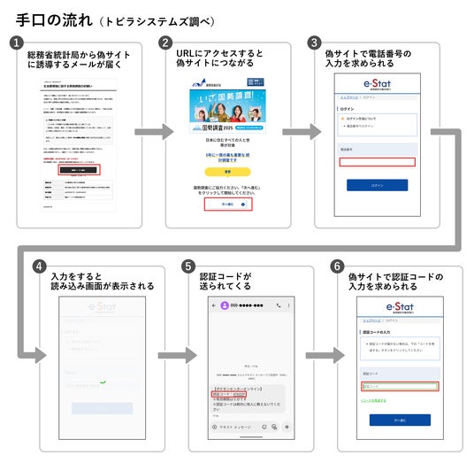 トビラシステムズの調査では、総務省統計局をかたるメッセージから偽サイトへ誘導し、電話番号や認証コードを盗み取る手口が確認されました。