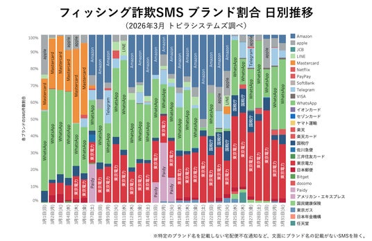 実在する企業やブランドをかたるSMSについて、2026年3月は「東京電力」「WhatsApp」をかたるSMSが1か月を通して継続的に発生しました。